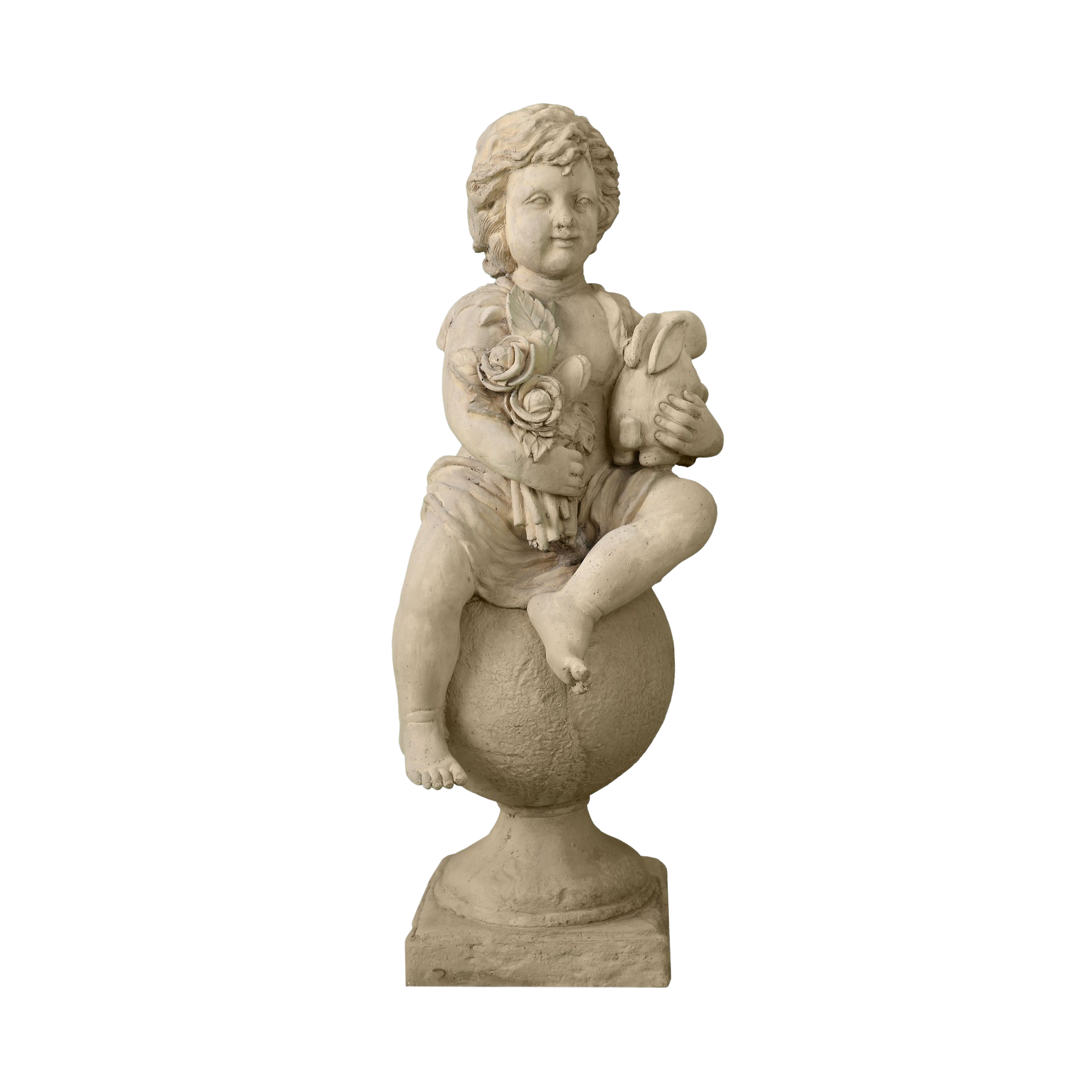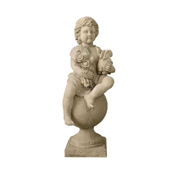 BOY WITH A BOUQUET – Clutching the first flowers of spring and a new born rabbit, the Sylvester Spring Boy is already kicking up his heels. Sitting proudly atop a globe, he is ready to oversee that part of the garden where the first green shoots will burst through.