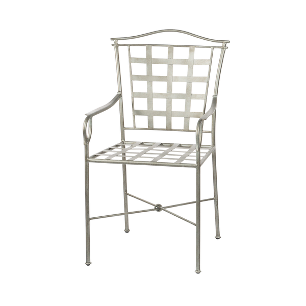 CURVES AND SQUARES – The Riviera Dining Arm Chair is a beautifully simple, beautifully solid outdoor dining chair. The bold checkerboard pattern on both seat and contoured backrest are relieved by a gently curved bar across the top. A pair of cross braces underneath ensure the chair's perfect rigidity. Larger than the Riviera Dining Side Chair, the arm chair has two, cleverly anchored armrests. The Riviera Dining Arm Chair pairs superbly with both square and circular tables, having both square and curved elements in its own design.