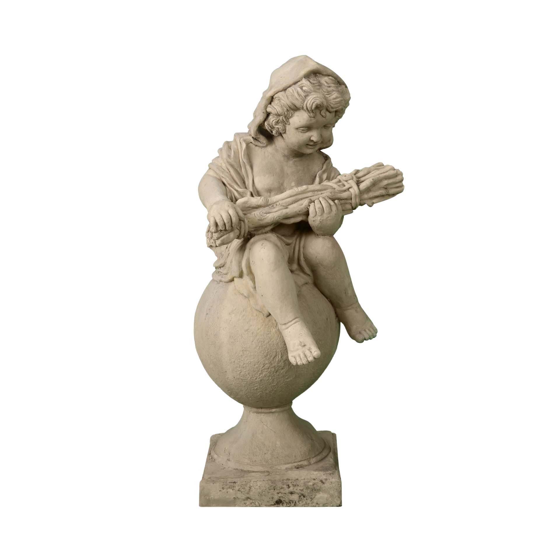 BOY IN A CLOAK – This putto child looks gratefully at a bundle of kindling gathered from the forest, and guaranteed to keep him warm through a winter’s night. Already he has pulled his cloak...