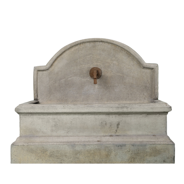 THE VILLAGE FOUNTAIN – Simple water troughs were once a feature of French villages, intended for everyday water collection. They, like the Mediterranean Fountain, had high backplates and solid troughs, with a wide lip for resting buckets on. This large, Mediterranean Fountain is designed to stand against a wall or hedgerow, and comes with a choice of water spouts. From the drop down menu, choose between a single, metal-like Varia spout or three lion head spouts to dispense water into the trough below.