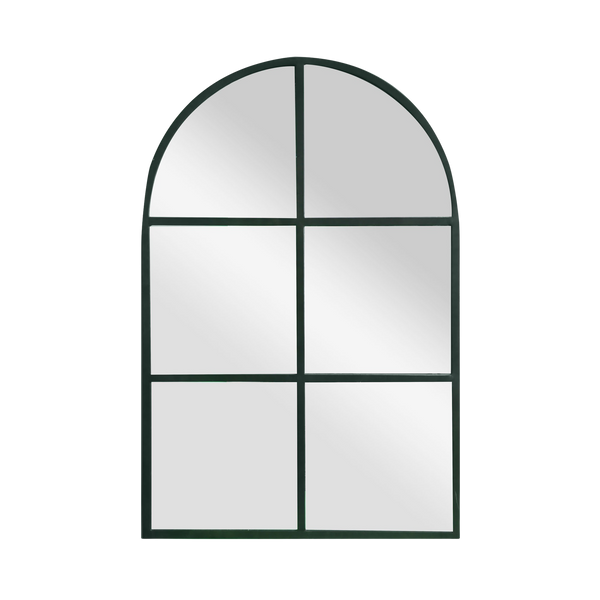 GARDEN OUTLOOK – The curved frame and cross bars of the Arched Metal Mirror produce a magical effect in an outdoor setting. Having the appearance of a large window, this mirror creates an illusion of more garden located beyond. It can also disperse extra sunlight into a shaded area.