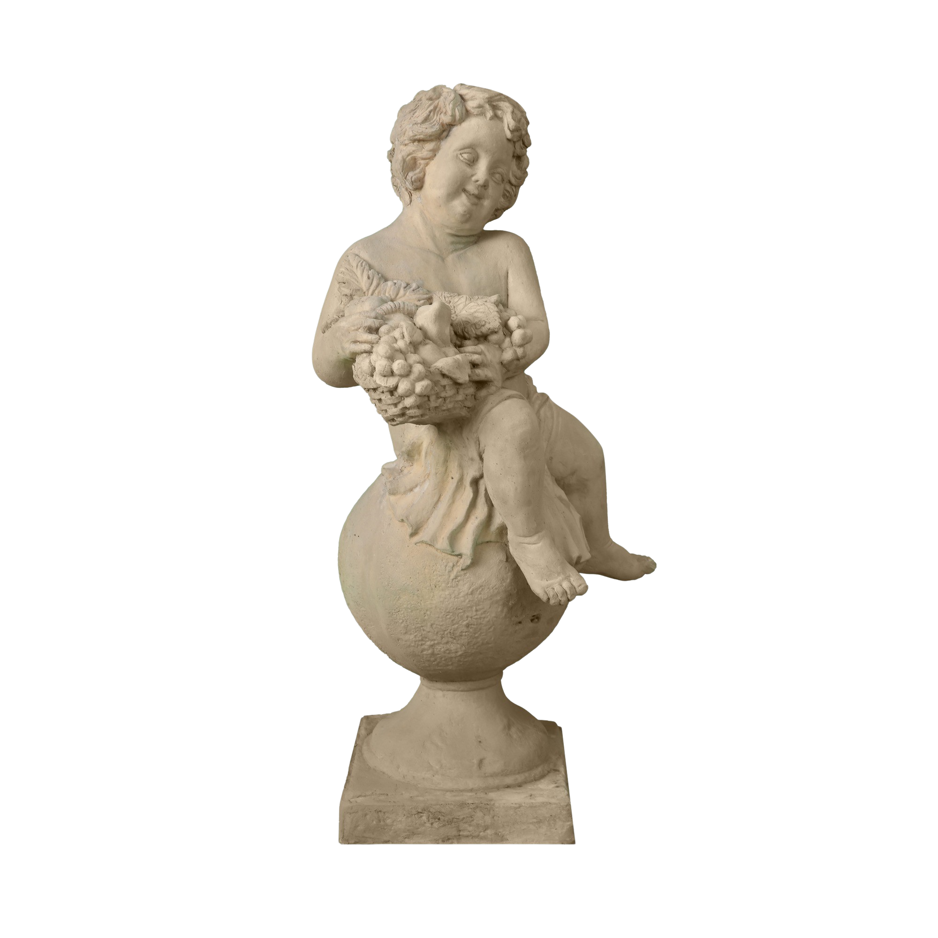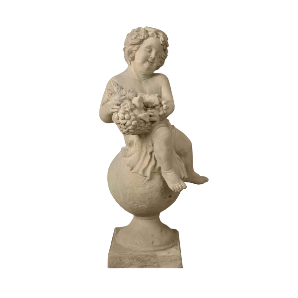 BOY WITH A BASKET – The Sylvester Summer Boy has gathered the produce of a bountiful growing season. The basket in his arms overflows with grapes, apples and more. But not for himself. Rather, his summer bounty is on offer to whoever passes by. He is the perfect little putto figure to place in a fruitful, bounteous garden.